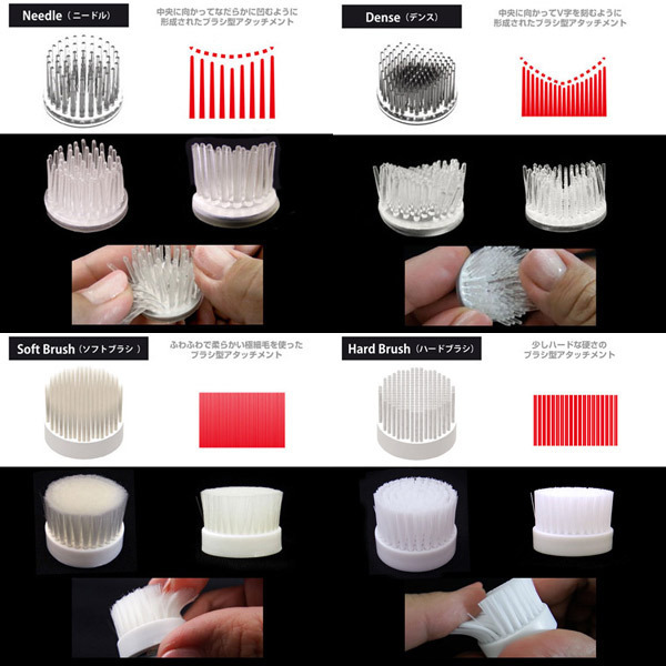 ●別売りの乳首吸引ローター専用●両乳首で楽しめる全4種×各2個●ニードル:丸く窪ませたすり鉢状●デンス:中央に向けV字に凹む形●ソフト:筆先のようにソフト極細●ハード:やや硬く刺激度も高め●ニードル&デンスはシリコン製●ソフト&ハードはブラシ形状。