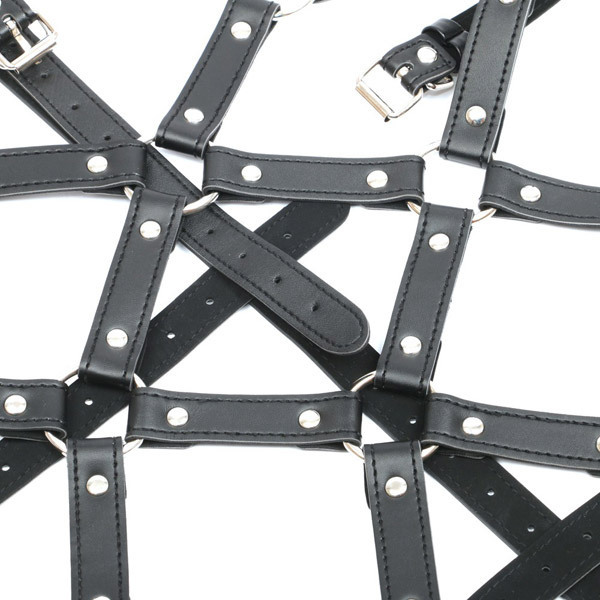 ●亀甲縛り仕様のボンテージ●優しい柔らかなベルト素材●ハードなスタッズデザイン●各ベルトは長さ調節可能。