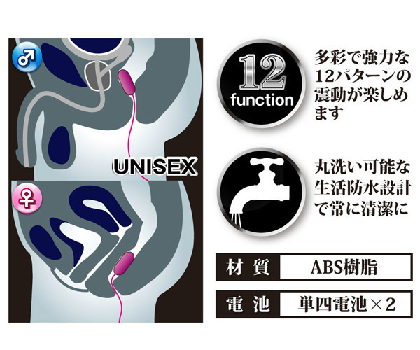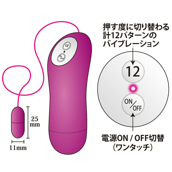 ●2.5×1.1cmのマイクロローター●12種の振動でリズミカルに刺激●ON/OFF・振動切替はワンタッチ●丸洗い可能な生活防水で清潔●単四電池×2本使用(別売り)。