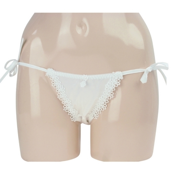 ●光沢感のある美しいフェリカ生地●ホワイトカラーのケミカルレース●フロント中央にお花モチーフ●バックは幅広レースのフルバック●クロッチスリットのオープン仕様●レディースMサイズ・日本製。