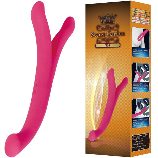 3分間以内のアクメ率なんと92%の瞬間絶頂!挟み込み&挿入どちらも楽しめるツインアームの双頭バイブ「シークレットガーデン トライ」。