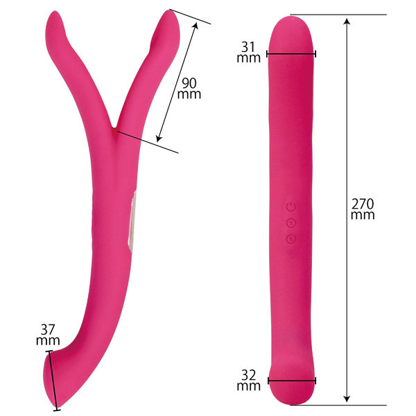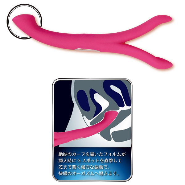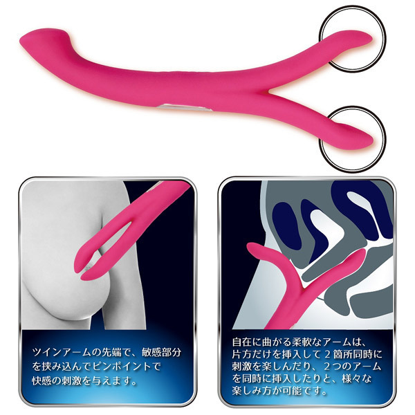 二股のアームで乳首やクリをピンポイントで挟み込み!また、J型に絶妙なカーブを描く逆側のテールバイブはGスポットを確実に捉え、芯まで響くアクメ必至の強力刺激をもたらします。