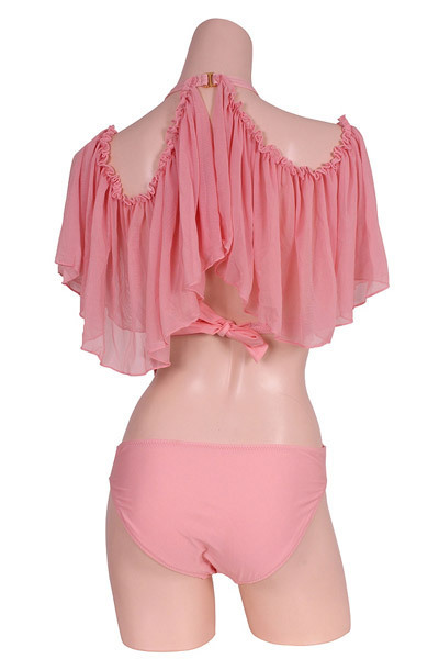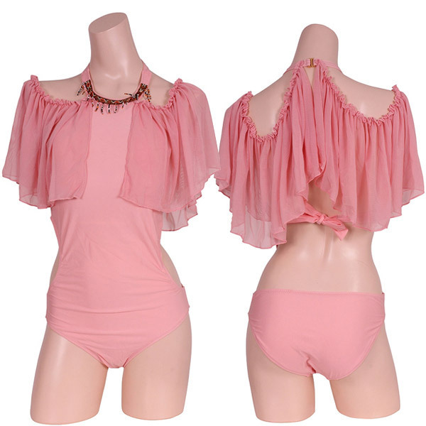 サーモンピンクをゴージャスにさせた!洗練美を加速するメッシュ素材のオフショルダーのワンピーススイムウエアー。