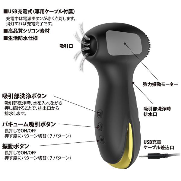 7種の吸引力と7種の振動パターンでクリトリスを吸い上げパワフル振動!唇に包まれ吸われるような快感が貴女を絶頂へと導きます♪吸引口の後ろ側にはモーターを内臓、表面の細かな突起で乳首や好きな箇所をピンポイントに刺激して楽しむのも有り!また、使用後の衛生面が心配という方も安心な生活防水付きで、吸引口から水を入れて洗浄することも可能。