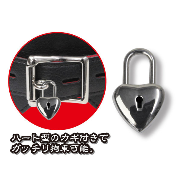 目元をガッチリ固定するベルトはハート型の鍵付き!ハードな中に可愛さをプラスした個性的なデザイン♪また、正面からベルトを締められるため着脱しやすく締め付け調整も簡単で、余計な手間がかからないからプレイもスムーズ!使用後のお手入れは乾いた布でサッと拭くだけと、機能面でも使いやすい逸品。
