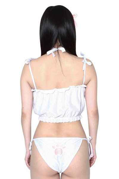 胸元を猫マークにくり抜いたふんわりシフォンのトップスと、いたるところに可愛らしいネコモチーフを取り入れた紐パンツ、そして鈴付きの猫耳カチューシャの3点セット!エロと可愛さを両立させたとってもキュートなキャットガールコスチュームです。