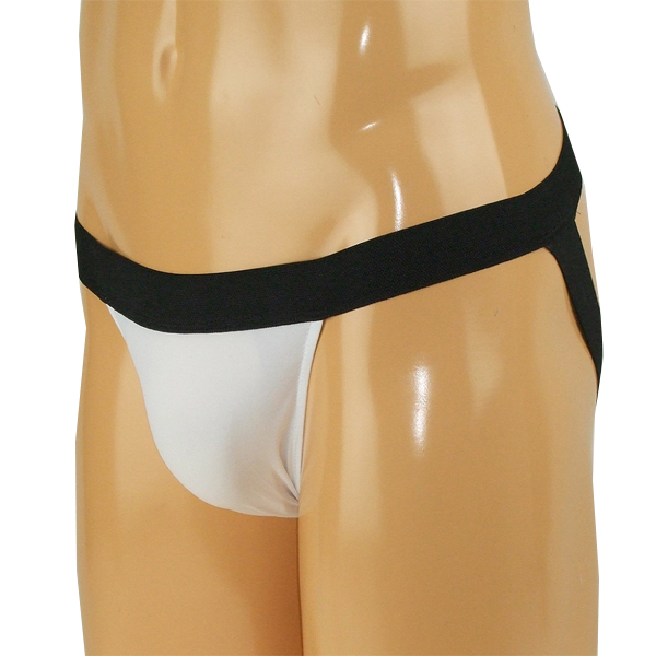 太めの黒い平ゴムが逞しさを感じさせる日本製のメンズ用Oバック(白)。