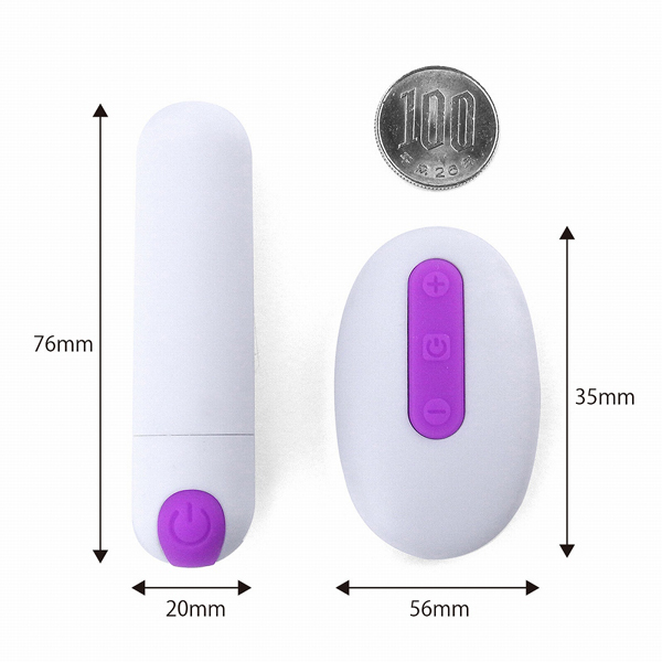 パッケージ:17.5×10.5×3.5cm 本体:ローター7.8×2.0cm・リモコン5.6×3.5×1.5cm 電池:本体(USB充電式)、リモコン(ボタン電池CR2032×1個)