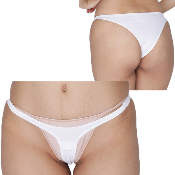 伸縮性のあるストレッチ生地がT字に食い込む刺激的なレディース用ハーフバック(白)。