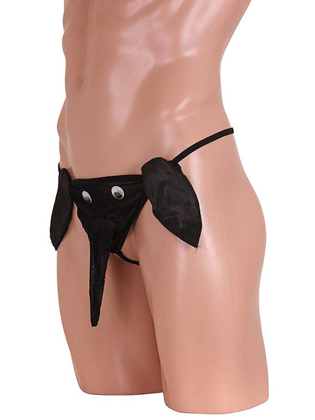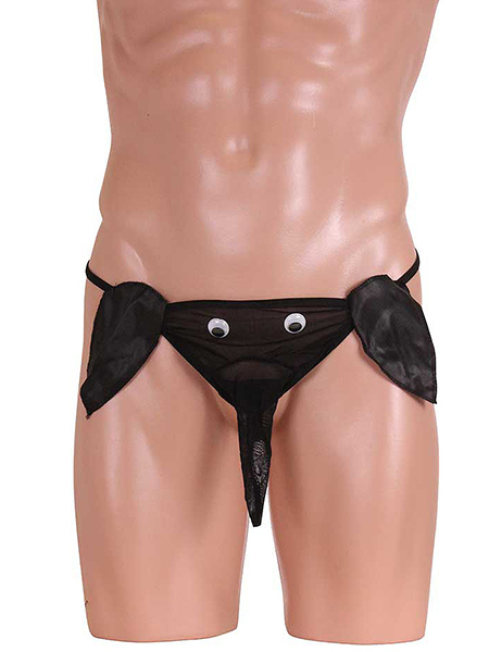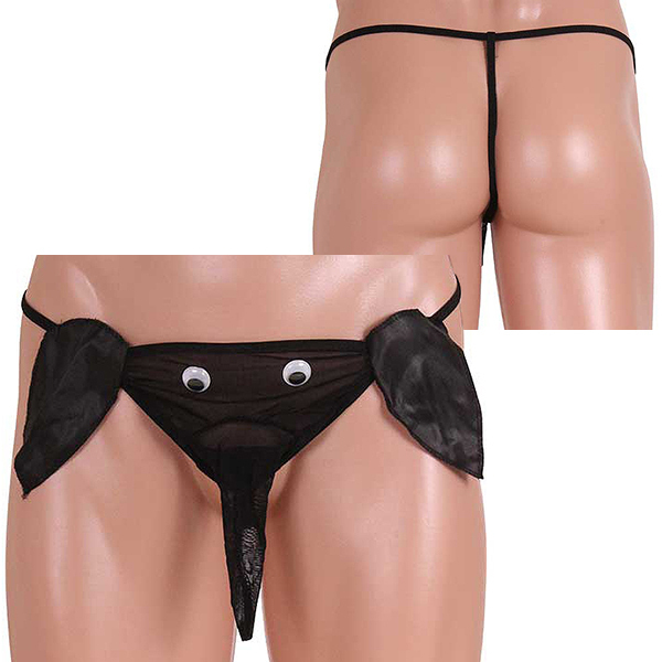 黒目がくるくる動く遊び心満載の男の象さんパンツ!透け感のあるパワーネットと光沢感のあるサテン生地のコラボが可愛い♪バックスタイルはGストリングで超セクシー!インパクト大のメンズパンツで主役級の存在感は間違いなし♪男らしいブラックカラーでナイトライフを楽しんじゃおう!