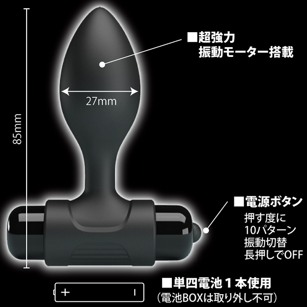 先端に内蔵された高性能モーターで奥深くまで強力振動を届ける電池式アナル専用プラグ。