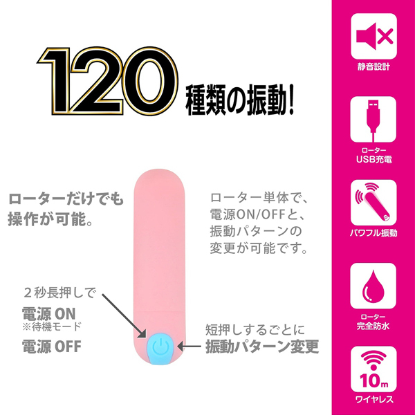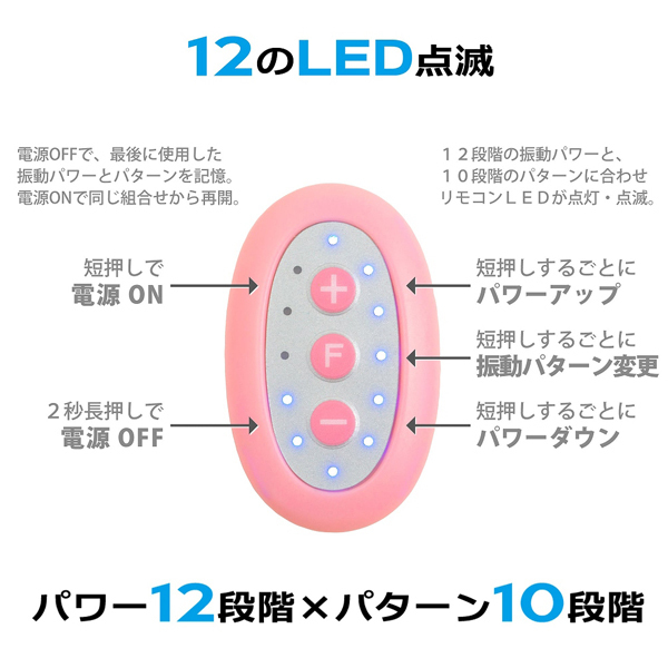 12段階の振動×10種類の振動パターンを搭載!豊富な快感から貴方好みの刺激が必ず見つかる♪10m先の範囲まで遠隔操作可能で、5分で自動的にOFFになる一時停止機能も完備!リモコンには目で見て解りやすいLED×12個も付いています。