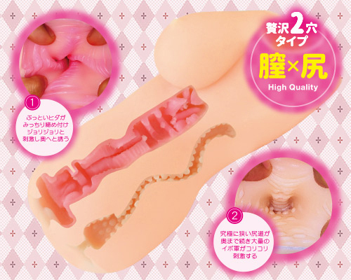 挿入口を抜けると太いヒダヒダがみっちりと締め付けながらあなたを襲い、奥に進むと不規則な突起構造とヒダが絶妙な刺激を与えてくれます!バックで楽しめるアナル側のアナル穴は、キツキツの湾曲した細長い穴が奥まで続き、アナルの壁には大量のイボイボが敷き詰められているので最初から最後までコリコリとした刺激を楽しめます。