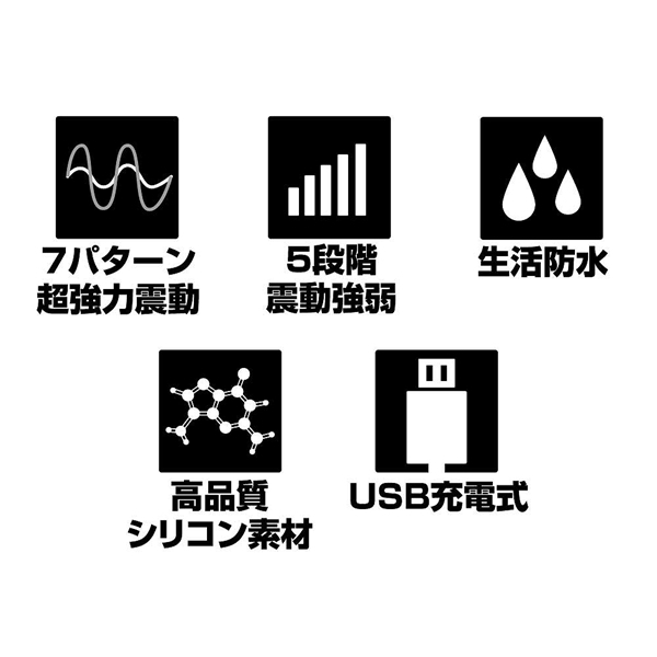 ボタン長押しで電源のON/OFFと7つの振動パターンの切り替えを、上下の[+][−]ボタンで5段階の震動パワーが調整可能です。