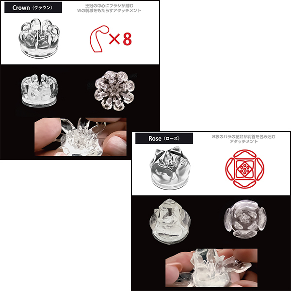 ●Crown(クラウン)王冠の中心にブラシが潜む、ダブル刺激のアタッチメント●Rose(ローズ)バラの8枚の花弁を模したアタッチメント。