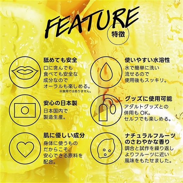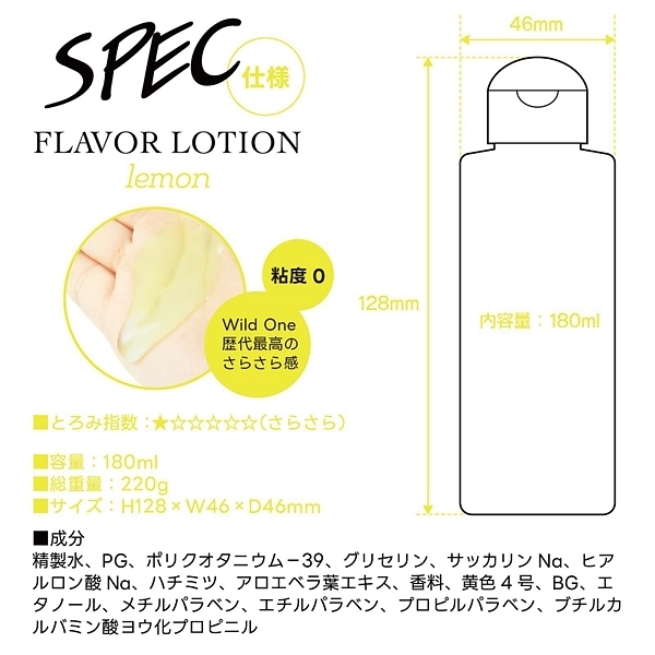 フルーティーな味と香りで新感覚プレイ!ワイルドワン女子が企画・開発した女性のためのフレバーローション!安心安全の国内素材で水のように「超さらさら」、フルーツみたいに美味しい水溶性ローションです!<成分>精製水、PG、ポリクオタニウム-39、グリセリン、サッカリンNa、ヒアルロン酸Na、ハチミツ、アロエベラ葉エキス、香料、黄色4号、BG、エタノール、メチルパラベン、エチルパラベン、プロピルパラベン、ブチルカルバミン酸ヨウ化プロビニル。