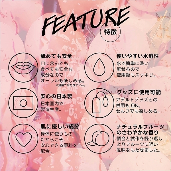 フルーティーな味と香りで新感覚プレイ!ワイルドワン女子が企画・開発した女性のためのフレバーローション!安心安全の国内素材で水のように「超さらさら」、フルーツみたいに美味しい水溶性ローションです!<成分>精製水、PG、ポリクオタニウム-39、グリセリン、サッカリンNa、ヒアルロン酸Na、ハチミツ、アロエベラ葉エキス、香料、赤色106号、BG、エタノール、メチルパラベン、エチルパラベン、プロピルパラベン、プチルカルバミン酸ヨウ化プロビニル。