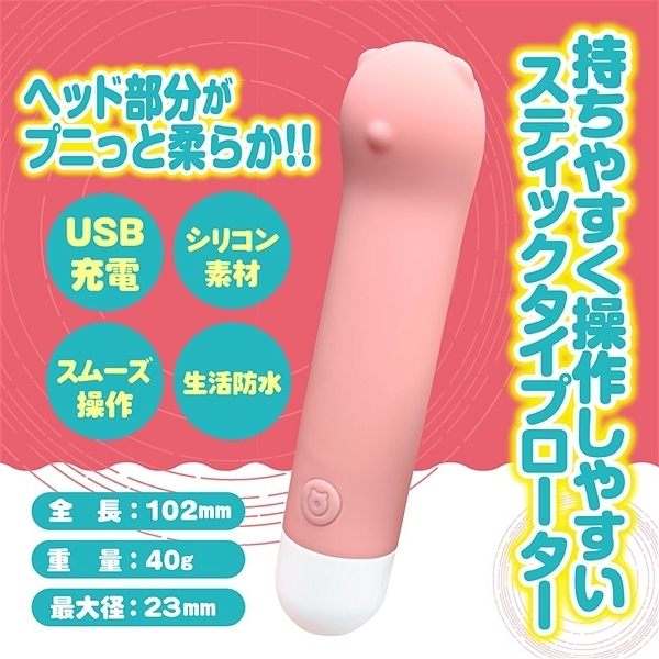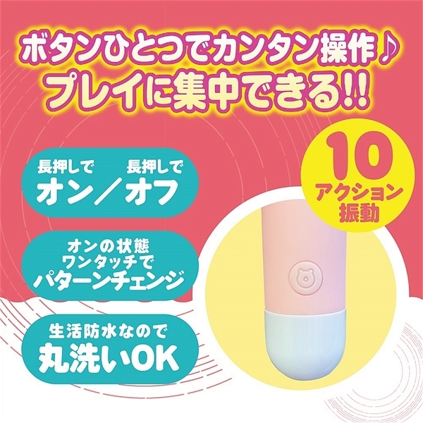 超軽量シリコンローターのベアーは、かわいい形だけでなく10モードのアクション振動とヘッド部を押しつけても痛くないシリコン素材を採用している柔らかローターです。