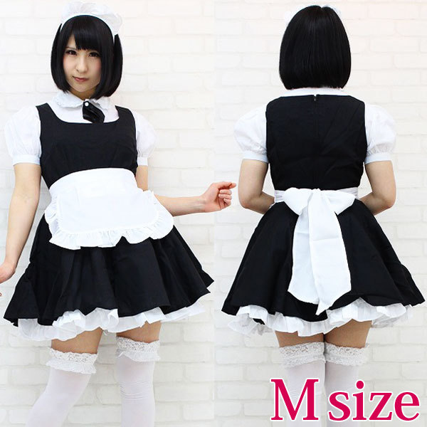 Mサイズ:B〜90cmcm・W〜72cm 丈:ワンピース78cm(裾フリル含む)・ブラウス54cm(袖丈21cm、袖幅30cm、肩幅39cm、首周り38cm) セット内容:ブラウス、タイ(ナップボタンにて取り外し可能)、ワンピース(背中ファスナー)、エプロン、カチューシャ