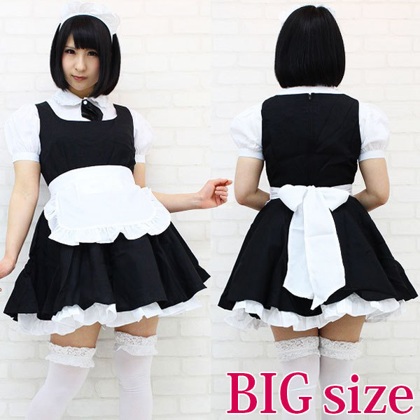 BIGサイズ:B〜104cm・W〜86cm 丈:ワンピース83cm(裾フリル含む)・ブラウス63cm(袖丈25cm、袖幅35cm、肩幅47cm、首周り43cm) セット内容:ブラウス、タイ(ナップボタンにて取り外し可能)、ワンピース(背中ファスナー)、エプロン、カチューシャ