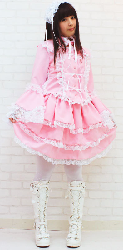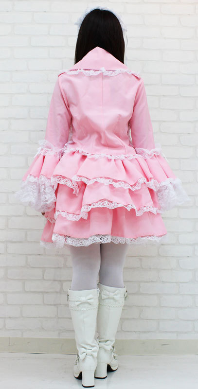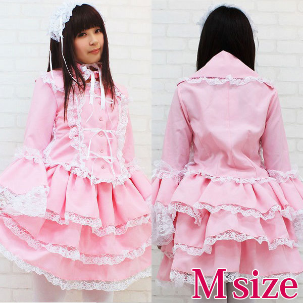 Mサイズ:B〜94cm・W62〜106cm 丈:上着48cm(袖丈62cm・肩幅38cm)・スカート48cm 付け襟(首回り)40cm セット内容:上着(前ボタン)・スカート(ウエスト部分ゴム、スカート3枚仕立て、裏地付き、チュールパニエ付き)・付け衿(ボタンにて着脱可)・ヘッドドレス