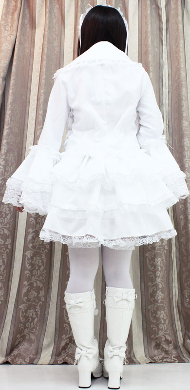Mサイズ:B〜92cm・W63〜110cm 丈:上着48cm(袖丈63cm・肩幅38cm)・付け襟(首回り)41cm・スカート48cm セット内容:上着(前ボタン)・スカート(ウエスト部分ゴム、スカート3枚仕立て、裏地付き、チュールパニエ付き)・付け衿(ボタンにて着脱可)・ヘッドドレス