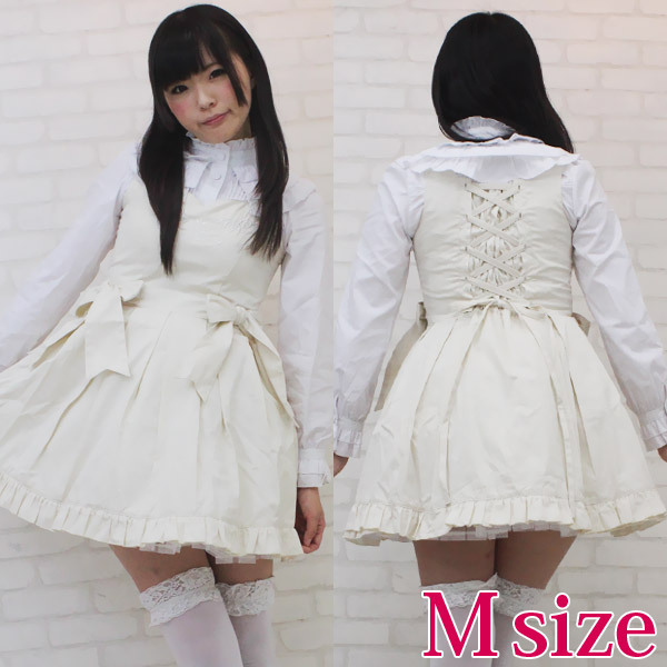 Mサイズ:B78〜86cm・W62〜74cm 丈:ジャンパースカート76cm・ブラウス49cm(肩幅36cm、袖丈61cm、袖口20cm) セット内容:ジャンパースカート(横ファスナー、後ろ編み上げシャーリング、パニエ内蔵)・ブラウス(前ボタン、後ろ編み上げシャーリング)