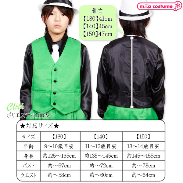 130サイズ 対応サイズ:身長125〜135cm・B〜67cm・W〜58cm 実寸:着丈41cm セット内容:ベスト単品(前ボタン) 素材:ポリエステル100%