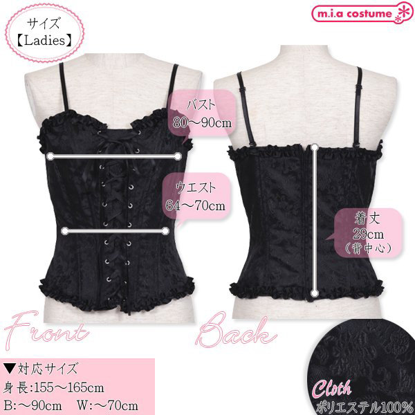 対応サイズ:身長155〜165cm・B〜90cm・W〜70cm・H〜96cm 実寸:B80〜90cm・W64〜70cm・着丈29cm(背中心) セット内容:コルセット単品(背中心ファスナー) 素材:ポリエステル100% モデル身長155cm