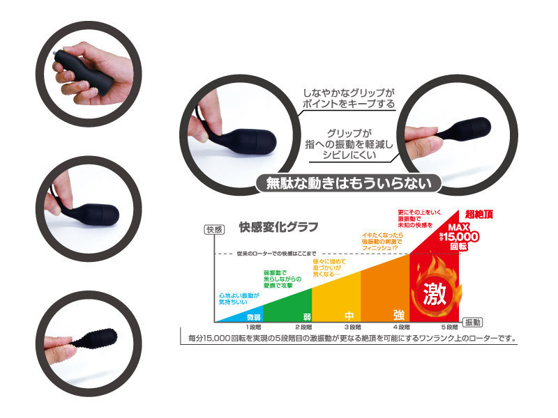 毎分15000回転が生み出す激しい絶頂感!最上級即逝きモード『激』搭載シングルローター。