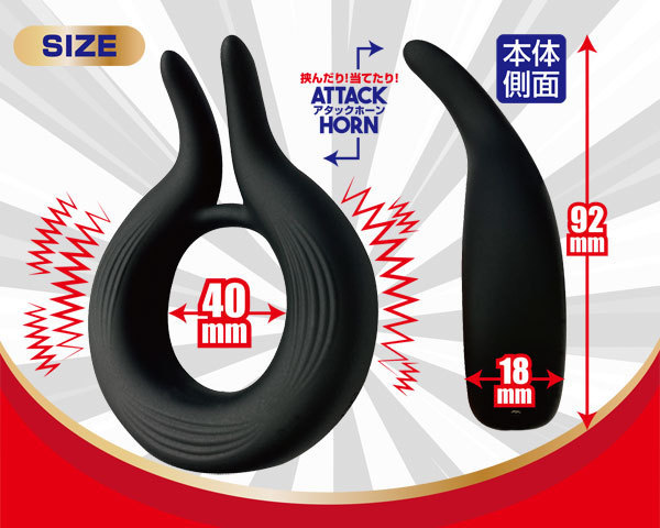 電動タイプのペニスリングや電動サックを探していた方も、これさえあれば勃起力と持続力が大幅にアップ!先端部分の2つのツノがクリを挟み込み、密着時にはお互いが刺激を得られます♪本体はシリコン製で内径は約4cm。