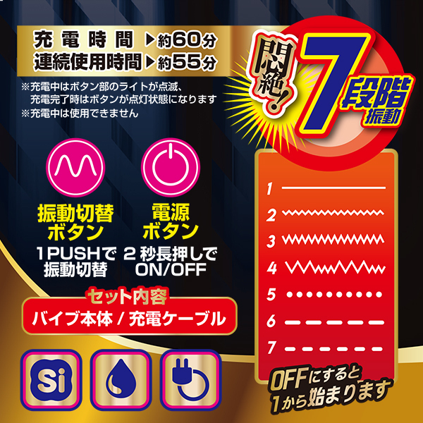 膣内にも優しくなじむシリコン製で肌触りはソフトでなめらか♪子バイブは先端のバイブと連携しているので強弱含んだ7パターンの振動が楽しめます。