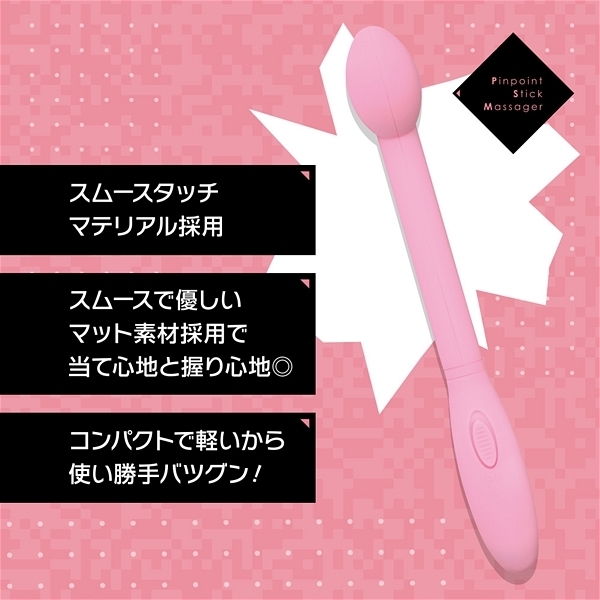 こちらは女性に人気のピンクカラーで、気持ちいい部分を優しく振動責めできる超軽量なバイブスティックです♪スマート形状で握りやすく、コンパクトで使い勝手の良い女性のセルフプレジャーアイテム!持ちやすくて軽いので、普段のセルフ使いに大活躍すること間違いなしです♪電源は単4電池1本となります。