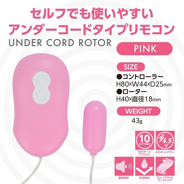 コントローラーの下側からコードが出ているためセルフプレイ時も通常時もコードの煩わしさが軽減されたスタイリッシュデザインのローターです♪握れば分かる使いやすさがウリで、他にはない使いやすさを重視したアンダーコードスタイルが特徴!単四電池3本を使用した4.5Vの強力振動マイクロモーターが搭載されていて、小径ローターで可愛いカラーバリエーション、さらにはマット加工を施すことで上質感を極めた新型ローターです♪10パターンの振動を備え、ハイパワーの4.5V仕様!生活防水仕様なのでローター本体の水洗いもできてローター部分はマット加工だから当て心地も良好♪10パターンアクションをワンプッシュで簡単にONOFF操作が可能です。