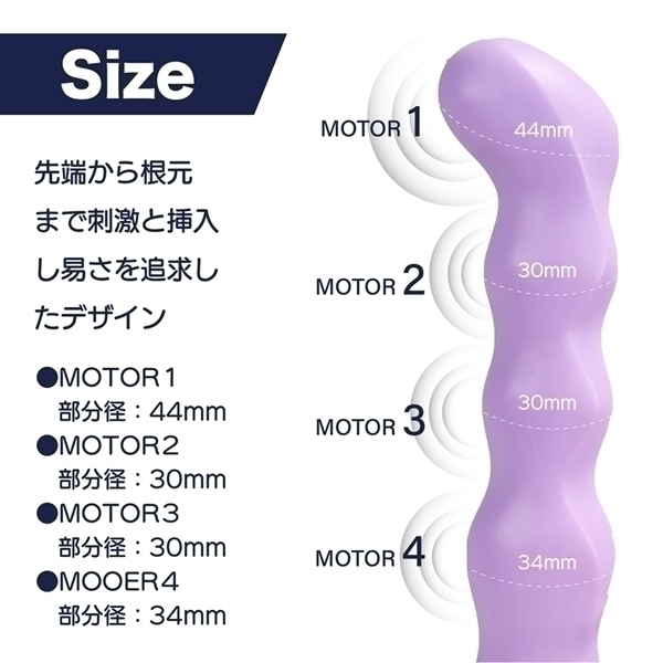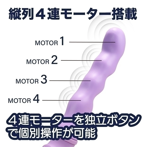 4つのモーターを搭載したハイパフォーマンスモデルです♪先端から根元まで並んだモーターは、それぞれ個別に細かく操作が可能!3段階の振動強弱と5種類のパターン振動を自由に組み合わせて、お好みのリズムを作り出せます♪先端を強めに、根元をリズミカルに設定するなど、多彩な楽しみ方ができます!さらに特別なCLIMAXボタンを押せば、全モーター振動や順番に波打つようなウェーブ振動など、4種類の特別なモードを楽しめます♪表面にはやわらかさと滑らかさを追求した特殊TPE素材を採用!手になじむ自然なフィット感が魅力です♪充電時間は約60分、最大90分の使用が可能!