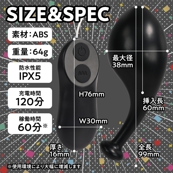 本体サイズ:コントローラー:3.0×7.6×1.6cm ローター:全長9.9cm×挿入長6.0cm 最大径3.8cm 重量:64g USB充電ケーブル USB充電式