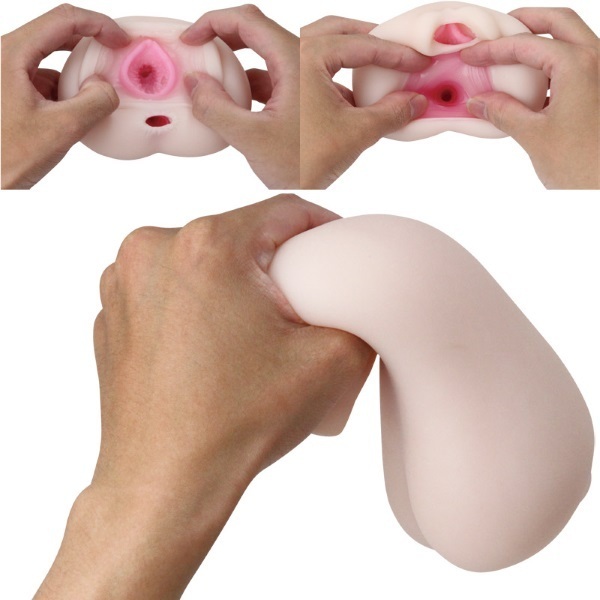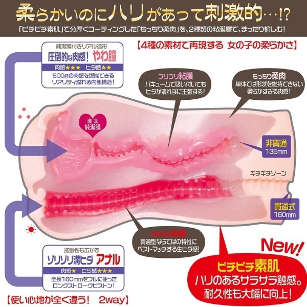 単体では維持できないほどムニョーンと柔らかな素材をハリのある素材でコーティング!肉厚ボリュームで女性の柔ボディを再現した二穴オナホ。