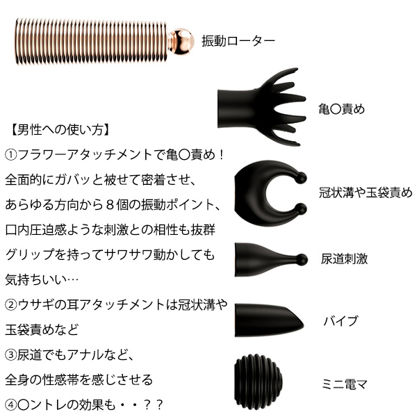 【男性への使い方】@フラワーアタッチメントで亀〇責め!全面的にガバッと被せて密着させ、あらゆる方向から8個の振動ポイント、口内圧迫感ような刺激との相性も抜群。