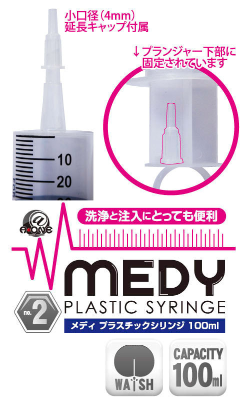 ●医療系グッズのMEDYシリーズ●お手軽なプラスチック製●容量たっぷりの100ml●注入量が一目で分かる目盛り入り●片手でも簡単に注入できるリング付き●小口径の延長キャップも付属。