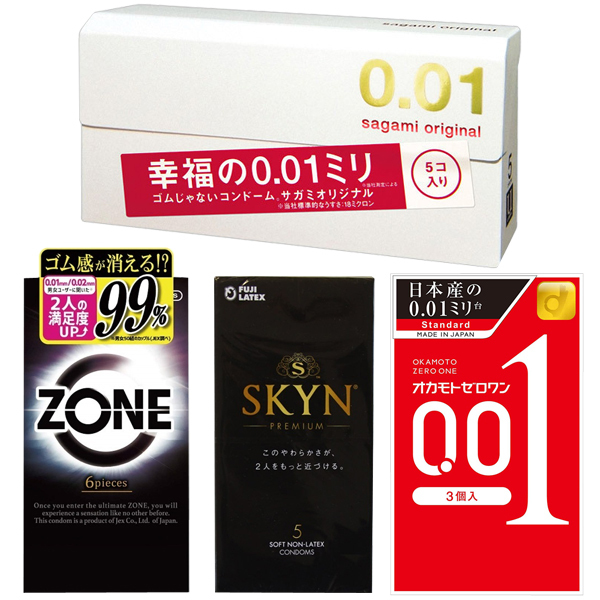 ※【セット内容】<オカモト>オカモトゼロワン 3個入(u00472)、<サガミ>サガミオリジナル0.01 5個入(u00475)、<ジェクス>ZONE 6個入り(u00412)、<不二ラテックス>SKYN 5個入(u00119)