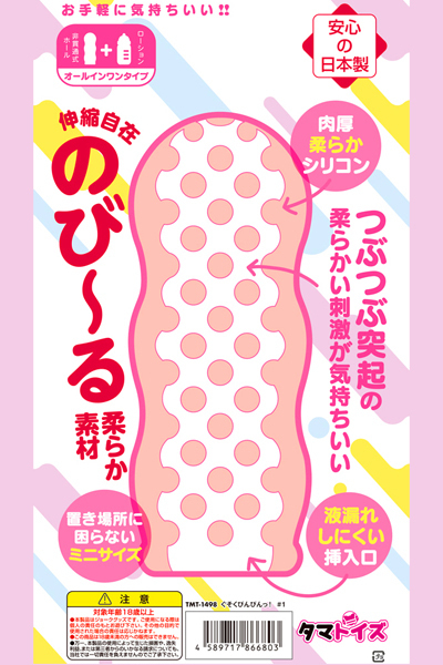 どこでも使える携帯タイプ♪肉厚柔らかシリコン使用!つぶつぶ突起の柔らかい刺激が気持ちい非貫通オナホール!伸縮自在の、のび〜る柔らか素材なのに、液漏れしにくい挿入口!舐めても安心・安全な日本製のローション付きのオールインワンオナホ。
