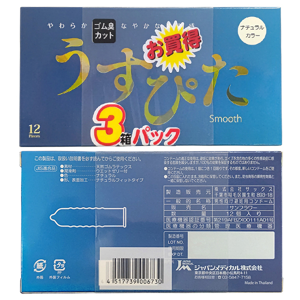 HOME > コンドーム > 薄い・厚い > うすぴた スムース 12個入り×3箱パック