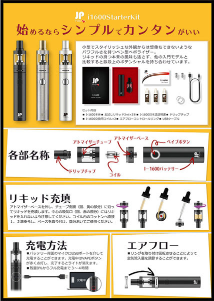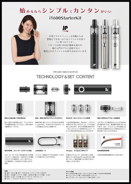 快適なVAPE(ベイプ)ライフをすぐに始められる特製BOX入りのフルセット!電子タバコのペン型ヴェポライザー「JPvapor I-1600 スターターキット シルバー」。