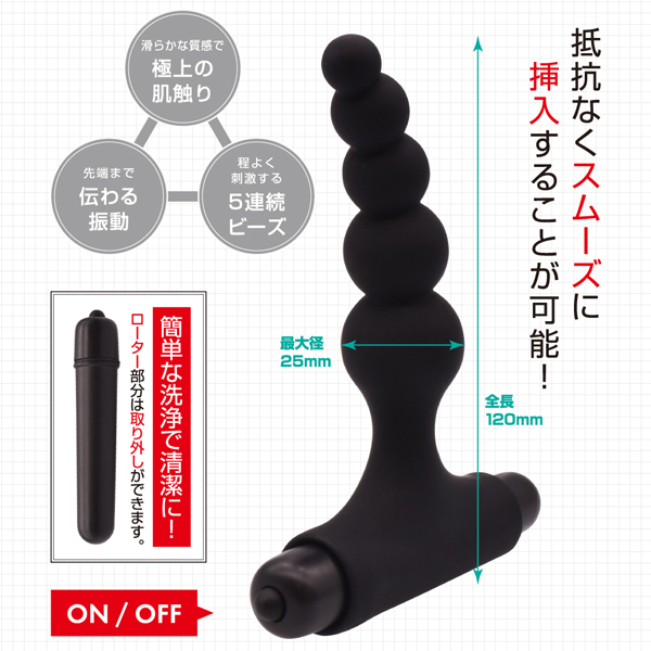 ポコポコとした刺激が楽しめる球体が5つ連なったビーズデザイン♪肌触り滑らかなシリコン素材を使用しているので、抵抗なくスムーズに挿入していただけます。