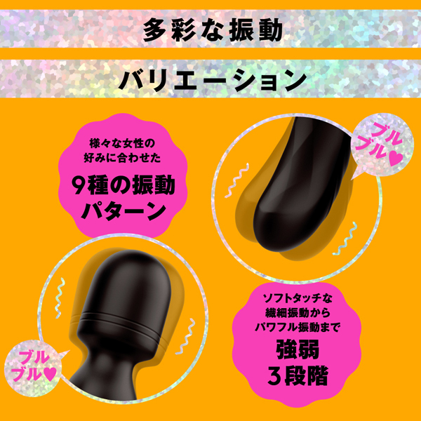 様々な女性の好みに合わせた9種の振動パターン&強弱3段階はソフトタッチな繊細振動からパワフル振動まで多彩な振動バリエーション!バイブ側にはヒート機能を搭載しています。