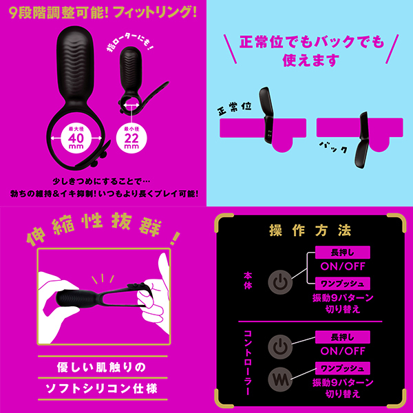 あの子の感度が爆上がり夢の同時イキができちゃうカップル用ローター!自分のサイズに合わせて調整できるフィットリングは9段階調整可能!ベルト式なのでプレイ中の着脱もラクラク!伸縮性バツグンで肌触りも優しい高品質ソフトシリコン仕様!9パターン振動のハイパワーローター搭載で激しい夜になること間違いなし!遠隔操作可能なコントローラー付きなので、プレイ中の振動パターンの切り替えが簡単!プレイ中も重さが気にならないように軽さにもこだわりました。
