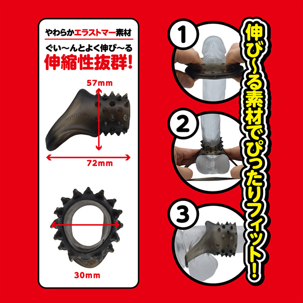 夜もがんばリングで大人気のやわらかメンズリング「ち●こリング」シリーズにスーパーなバンドが新登場!今度のち●こバンドは「ベースに装着するメンズバンド」!ぷにぷにっとした柔らかなTPE(エラストマー)素材は、ぐい〜んとよく伸びる高伸縮性!サイズ問わずでどんな大きさでもしっかりフィットの抜群の装着感&締付感!さらに、ツンツンとしたトゲトゲ突起による高刺激快感が!男らしさを引き立たせるスモークカラー!ほとばしるストロング、みなぎるパワー!