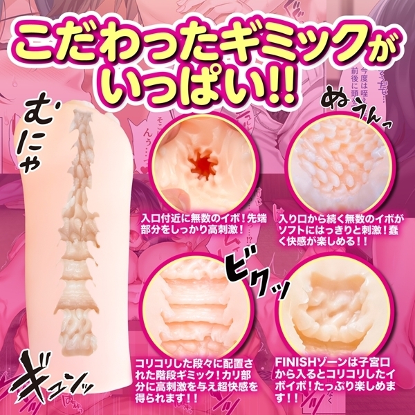 入り口付近に配列された無数のイボが先端部分をしっかりと刺激!入り口から続く無数のイボが蠢く快感を与え、段々に配列された階段ギミックの先にはコリコリイボが待ち受けるフィニッシュゾーン!無数のイボと階段構造ヒダのねっとりとした極上肉壁をお楽しみいただけます!