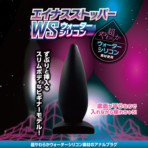 あのエイナスストッパーからウォーターシリコン素材を採用した新モデルが登場しました!こちらの「エイナスストッパー WSウォーターシリコン (02)」は先端部分が細めで根本付近が太くなるというスタンダードフォルムのアナルプラグです♪やや硬質なので抵抗感のあるタイプが好みの方には少し不向きといえます。